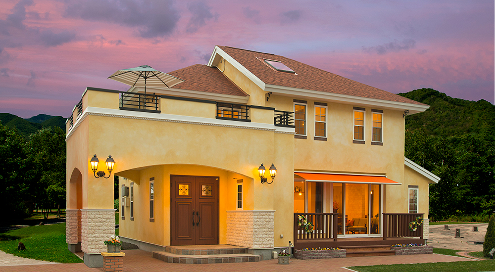 北海道マイホームセンター森林公園駅前会場に、エコアハウスの最新モデルハウス。 伝統様式にリゾートテイストを添えたデザインに、のびやかな広がりを感じさせる空間構成。 エコアハウスの最新モデルハウスは、太陽いっぱいの心地よい開放感と、自然環境に配慮したライフスタイルがテーマとなっている。
