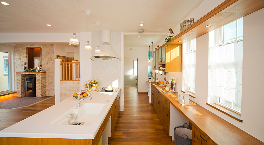 住空間には欧米的ライフスタイルの発想が随所に盛り込まれ、ホームパーティがお似合いのキッチンもそのひとつ。木の表情豊かなカウンターや背面の食器棚は、自然素材を使ったインテリアに調和し、みんなで食べたり飲んだりが余裕で楽しめる広さ。食器棚の延長にはミニシンクを備えたミセスコーナーがあり、お出かけ前のメイクも手軽にできそうだ。