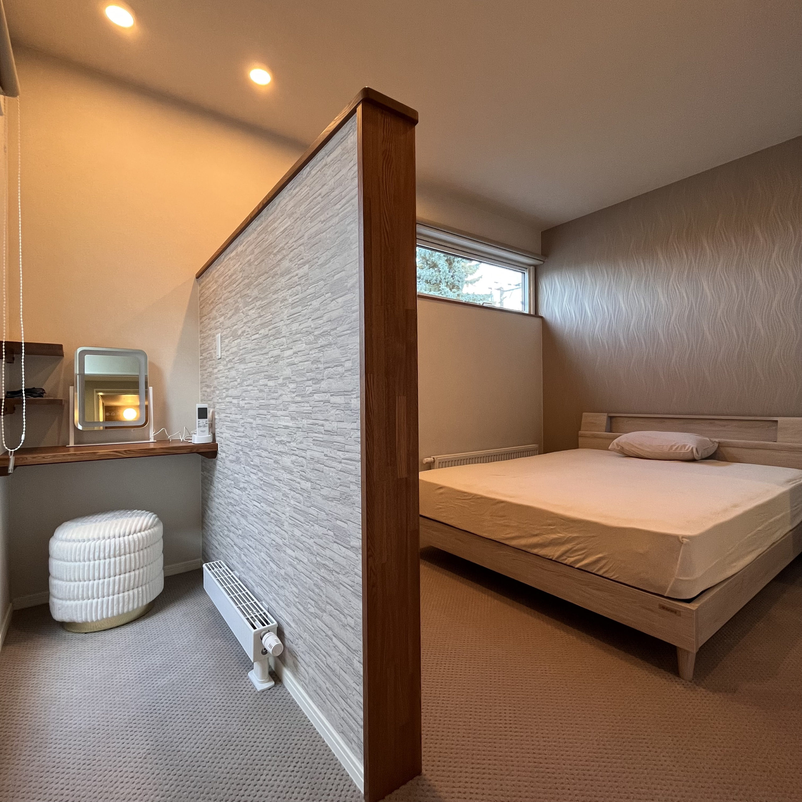 寝室は腰壁で仕切り、自然光が差し込むバルコニー側にはパウダールームを配置。