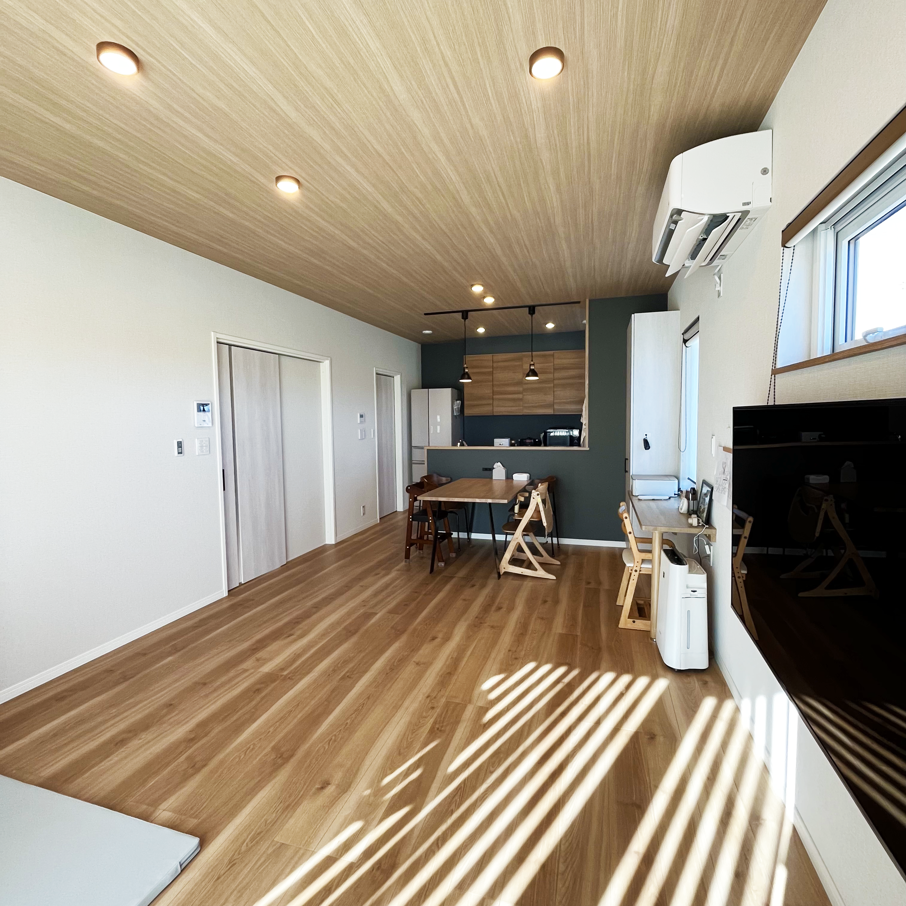 リビングの床と天井のクロスは、奥に向かって木目が伸びるように貼り、