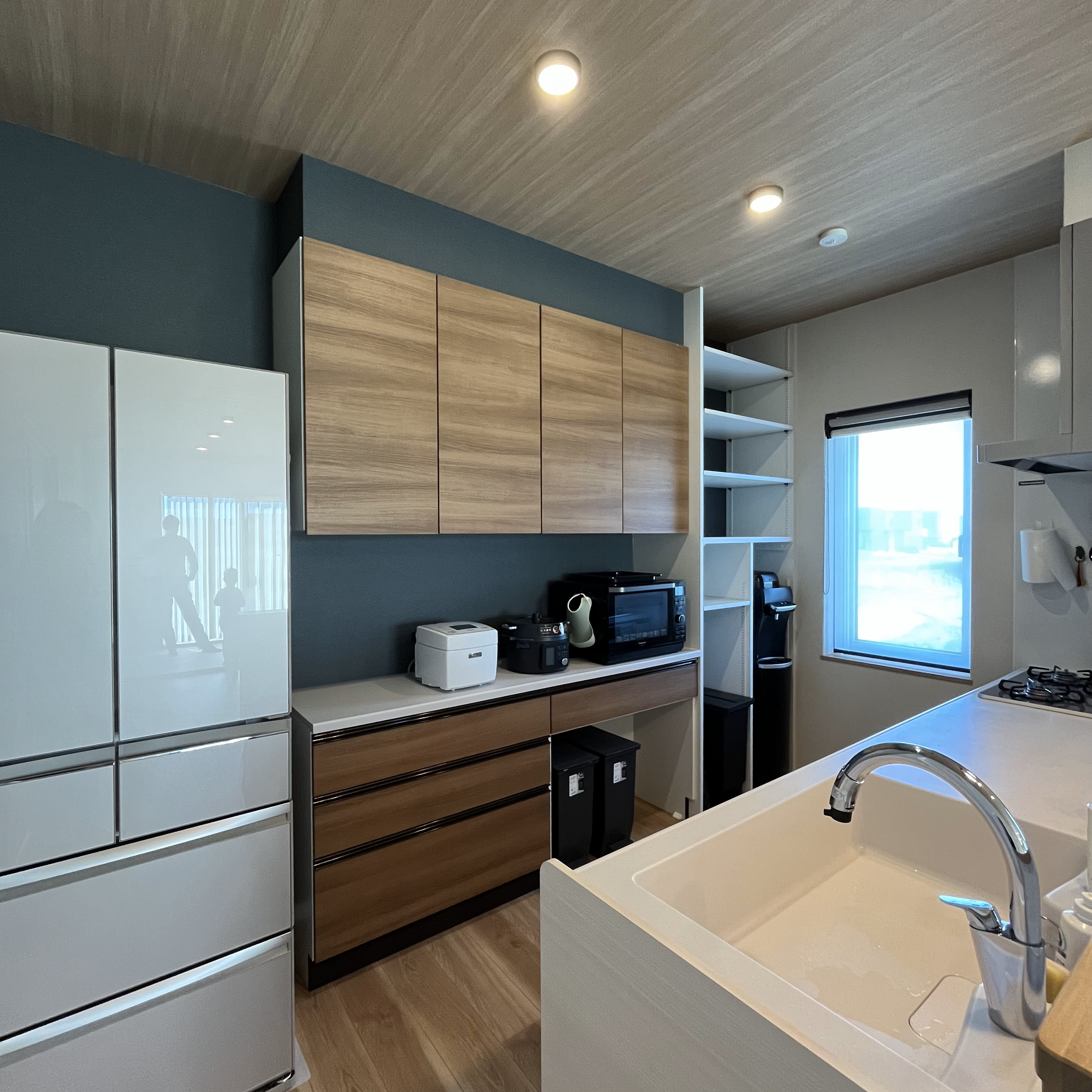 アクセントとなるグリーンのクロスはリビングとキッチンで色の濃淡をつけ、奥行きを演出。