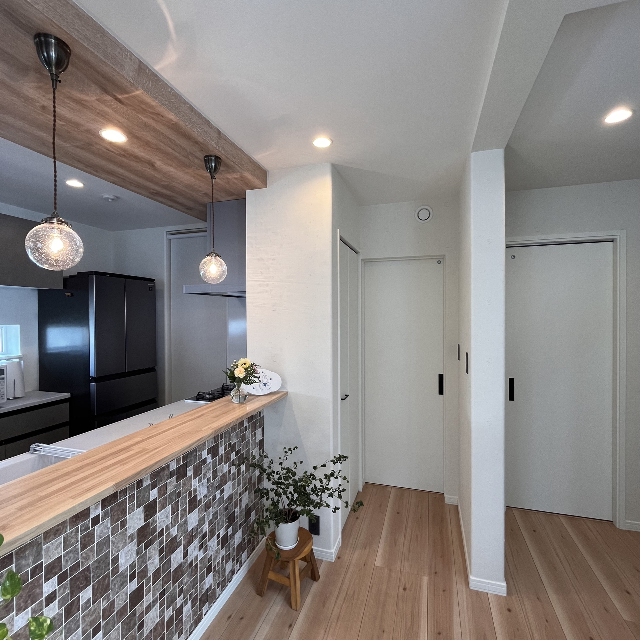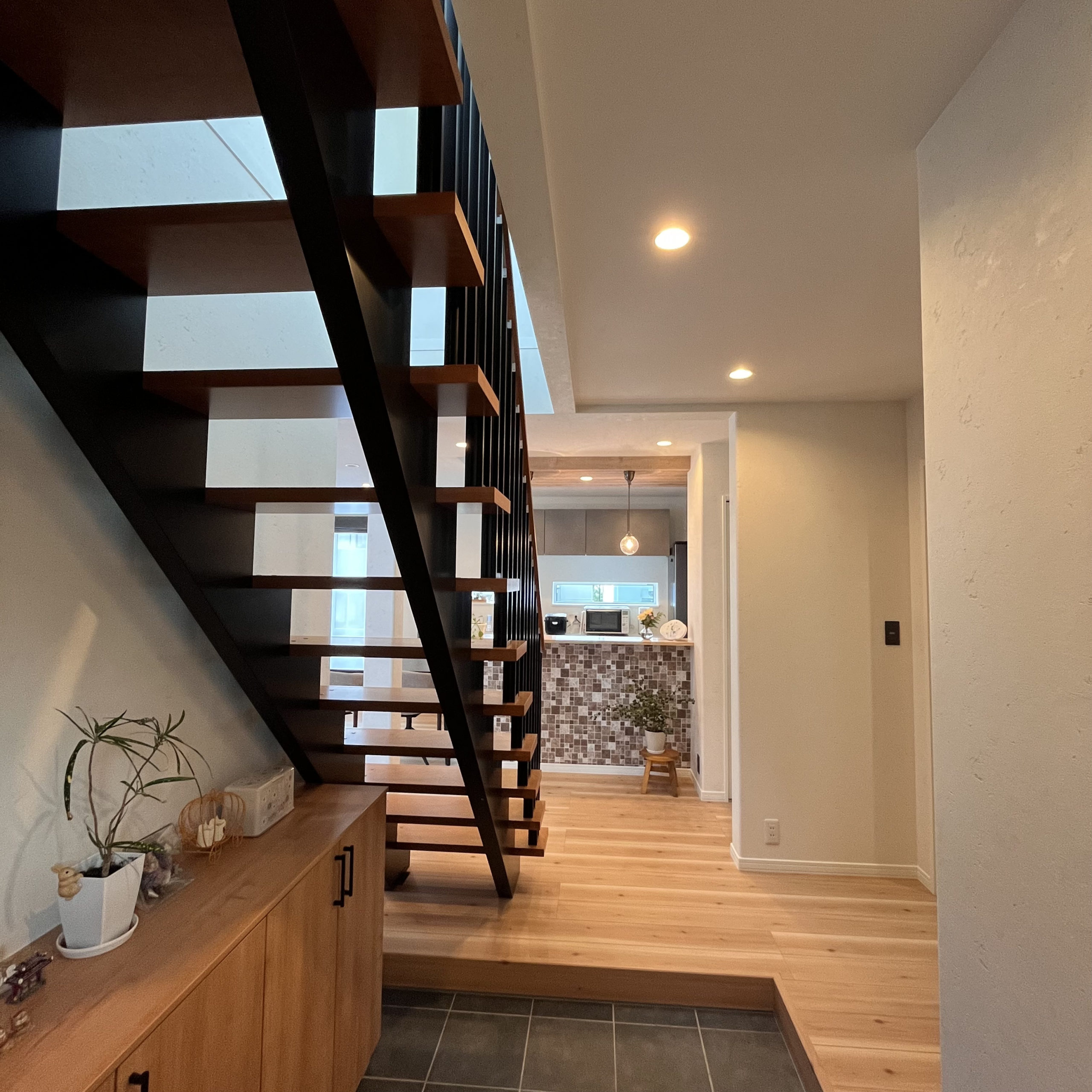 開放感のある玄関ホールからはキッチンが見え、タイル調のクロスや照明でおしゃれな空間を演出しています。