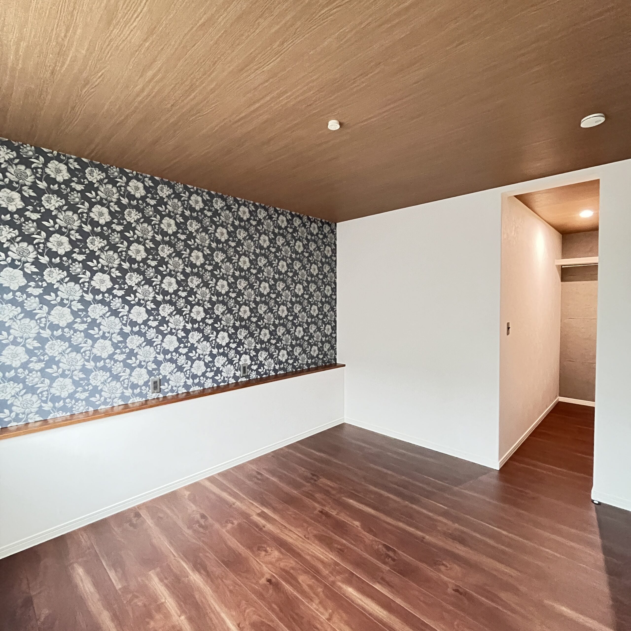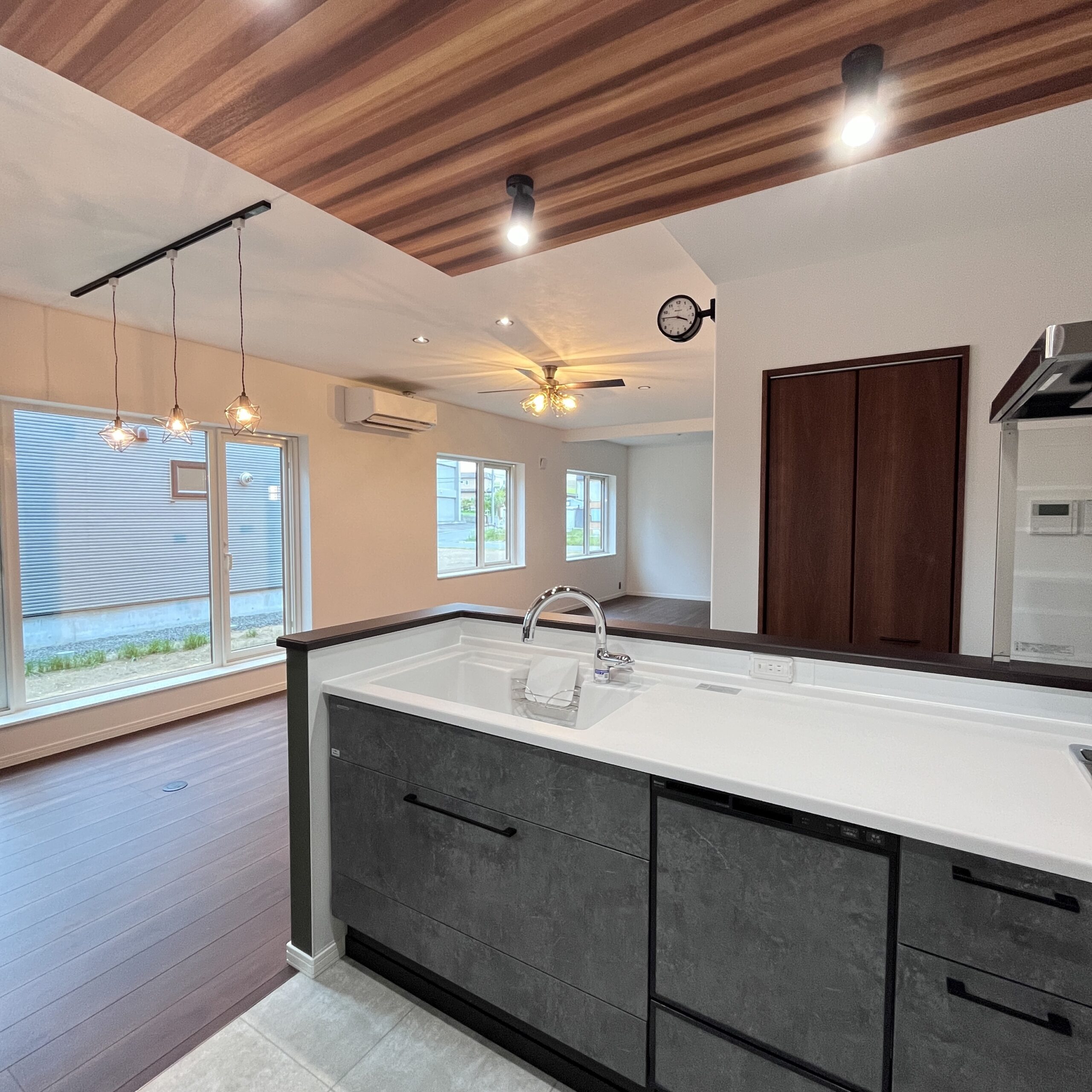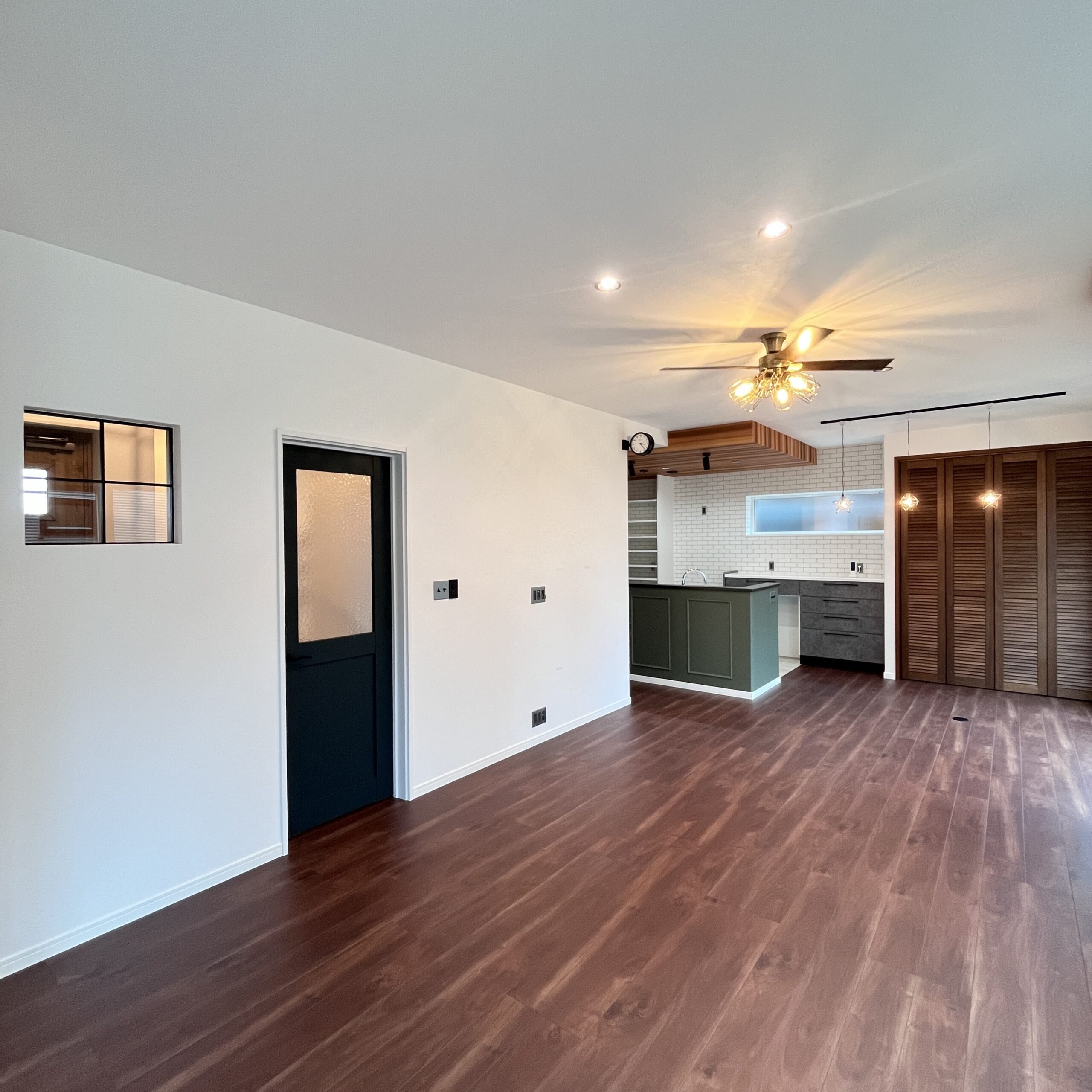 モスグリーンのクロス、ブラックウォルナットをベースにした床、そしてキッチンの上の下がり天井がマッチしており、