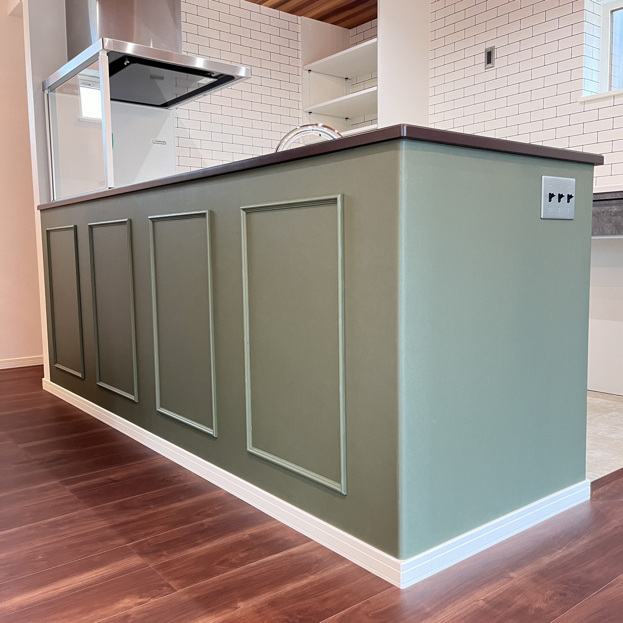 キッチンの腰壁にはモールディングを施し、カフェのようなおしゃれな雰囲気に仕上げました。