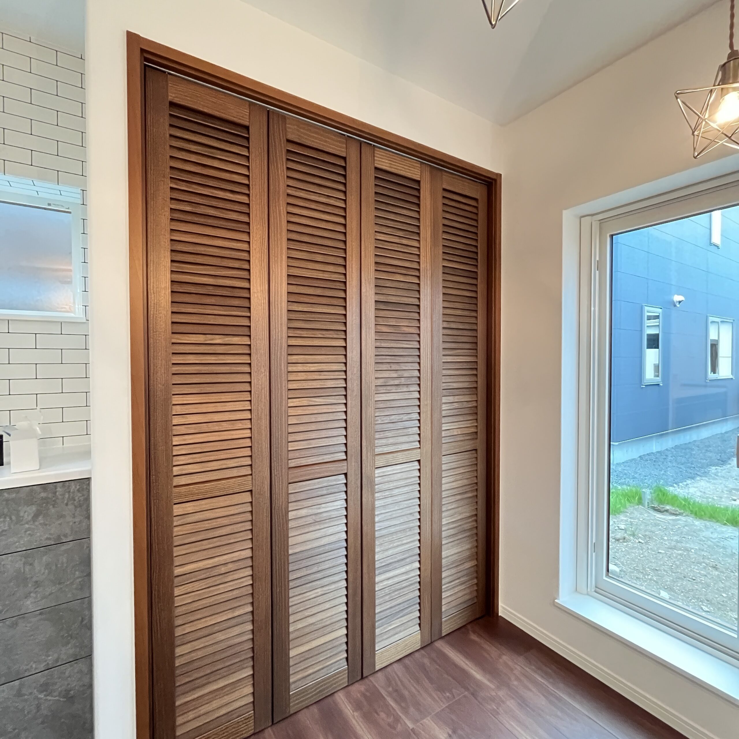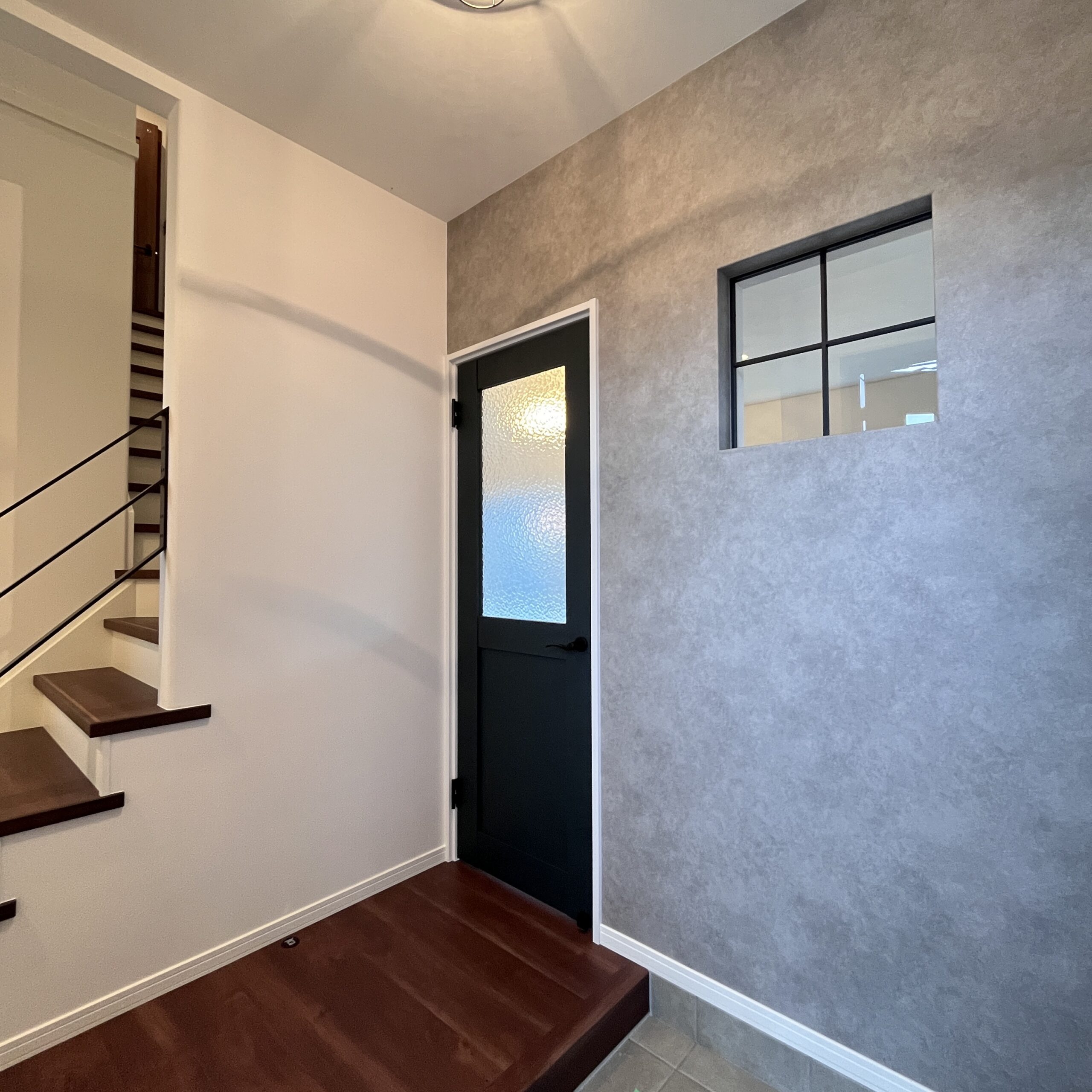 玄関に入ると目に入るのが、アイアン手すりの階段と、室内窓。