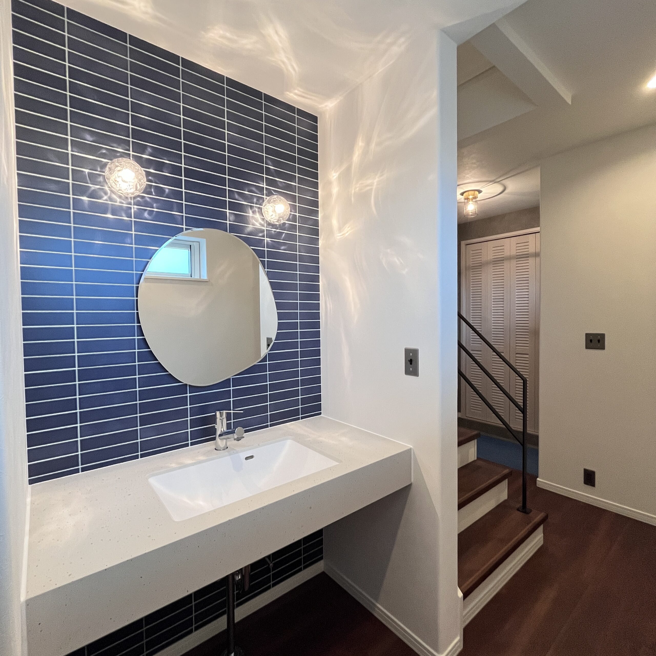 1階は回遊動線になっていて、玄関の横は造作の洗面化粧台があります。