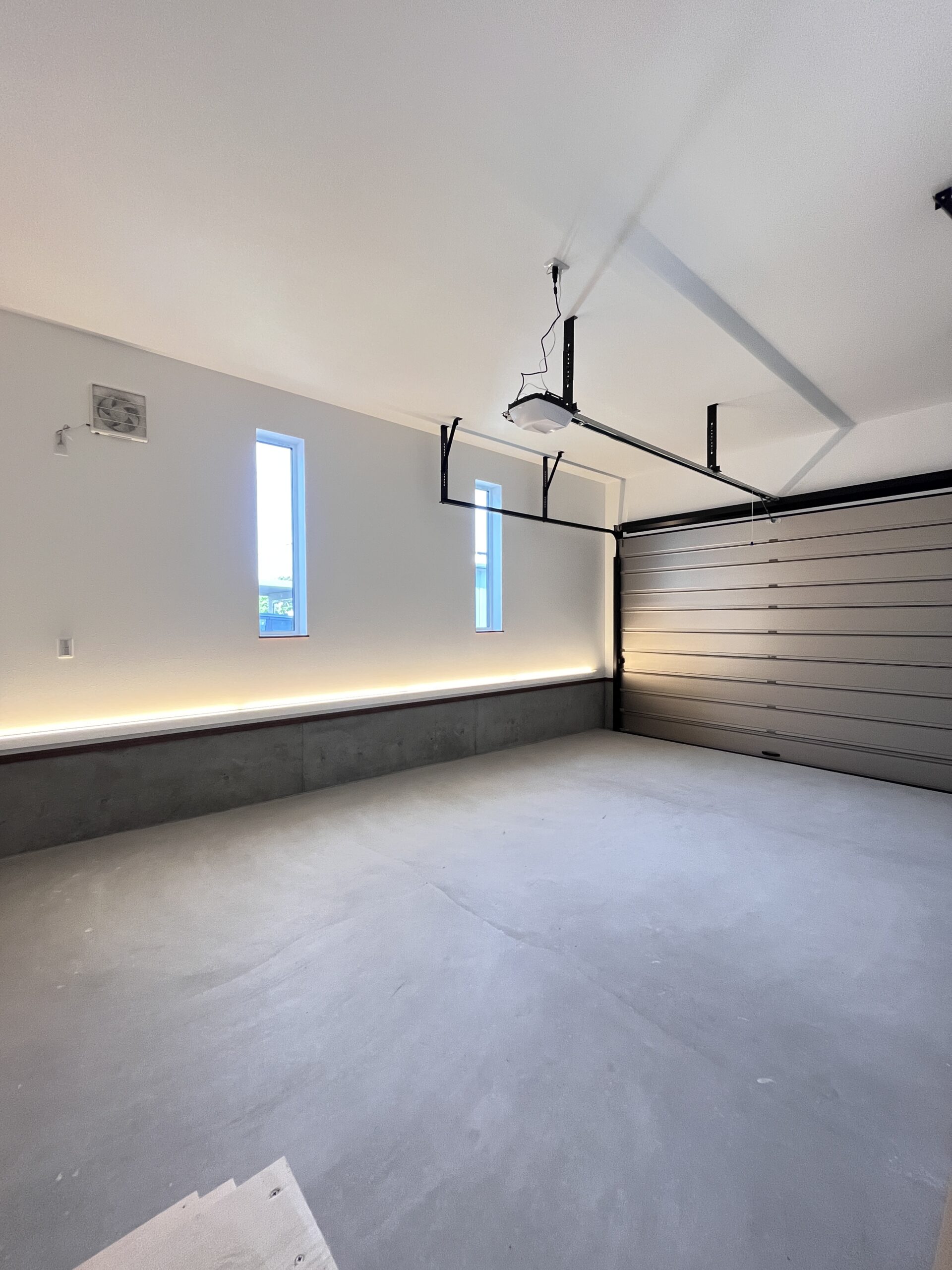 広々としたオーバースライダーシャッターのビルトインガレージを備えていて、ガレージ内の壁面には間接照明を設置。