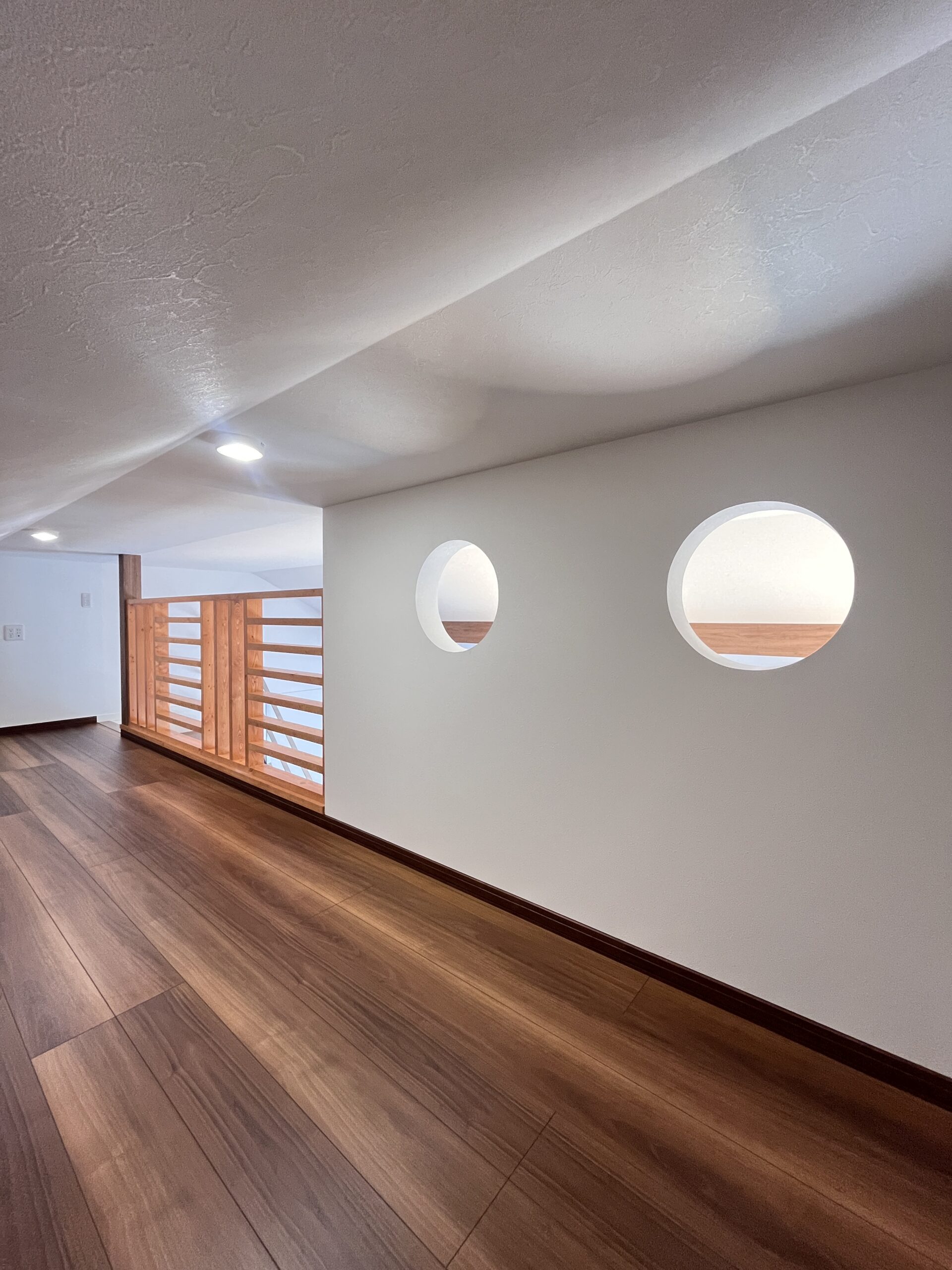 視線を上げると鉄骨階段の先にロフトがあり、2つの丸窓からLDKを見下ろせる遊び心ある工夫がされています。