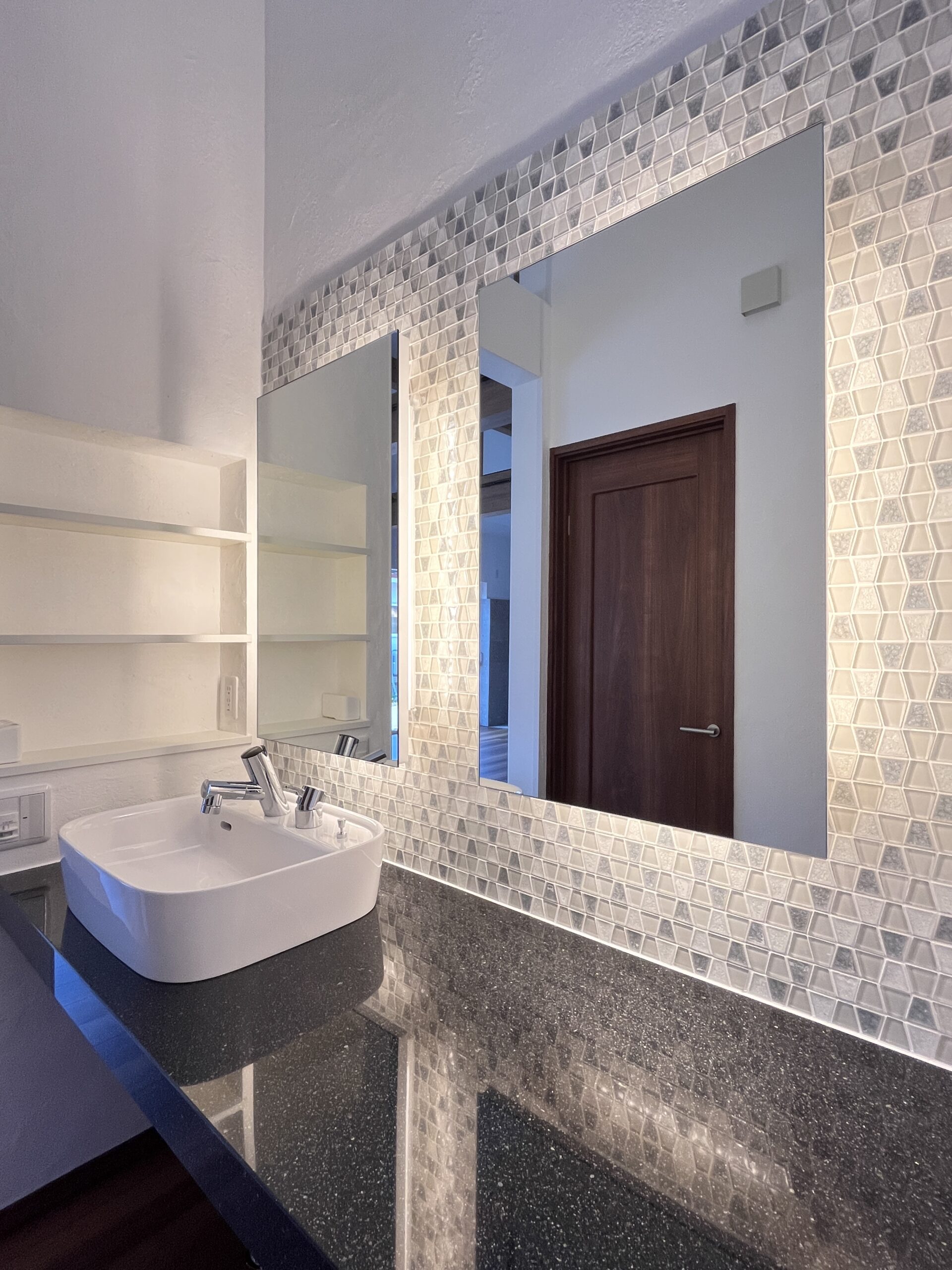 幅広のカウンターと大きな鏡を2枚設置した洗面化粧台は、透明感のあるタイルがとても美しく印象的です。
