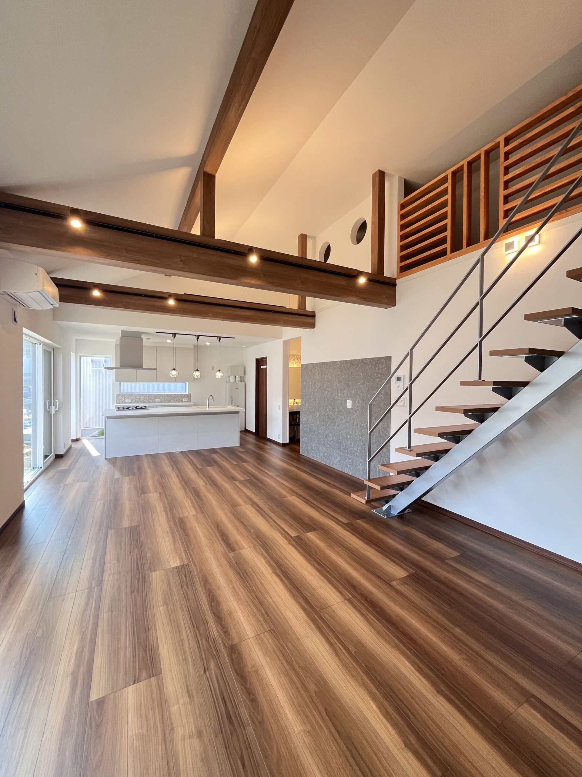 LDKに足を踏み入れると、吹上天井と梁が解放感と温もりを演出。