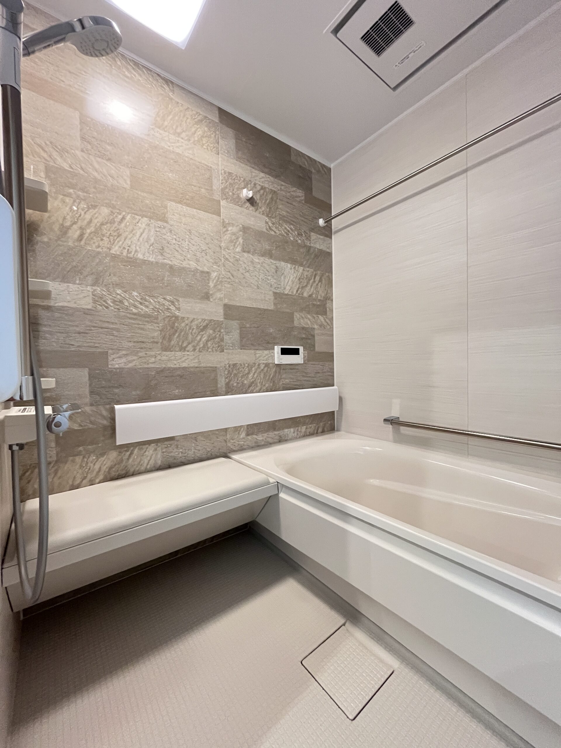 浴室には、通常カウンターが付く位置にベンチを設置。