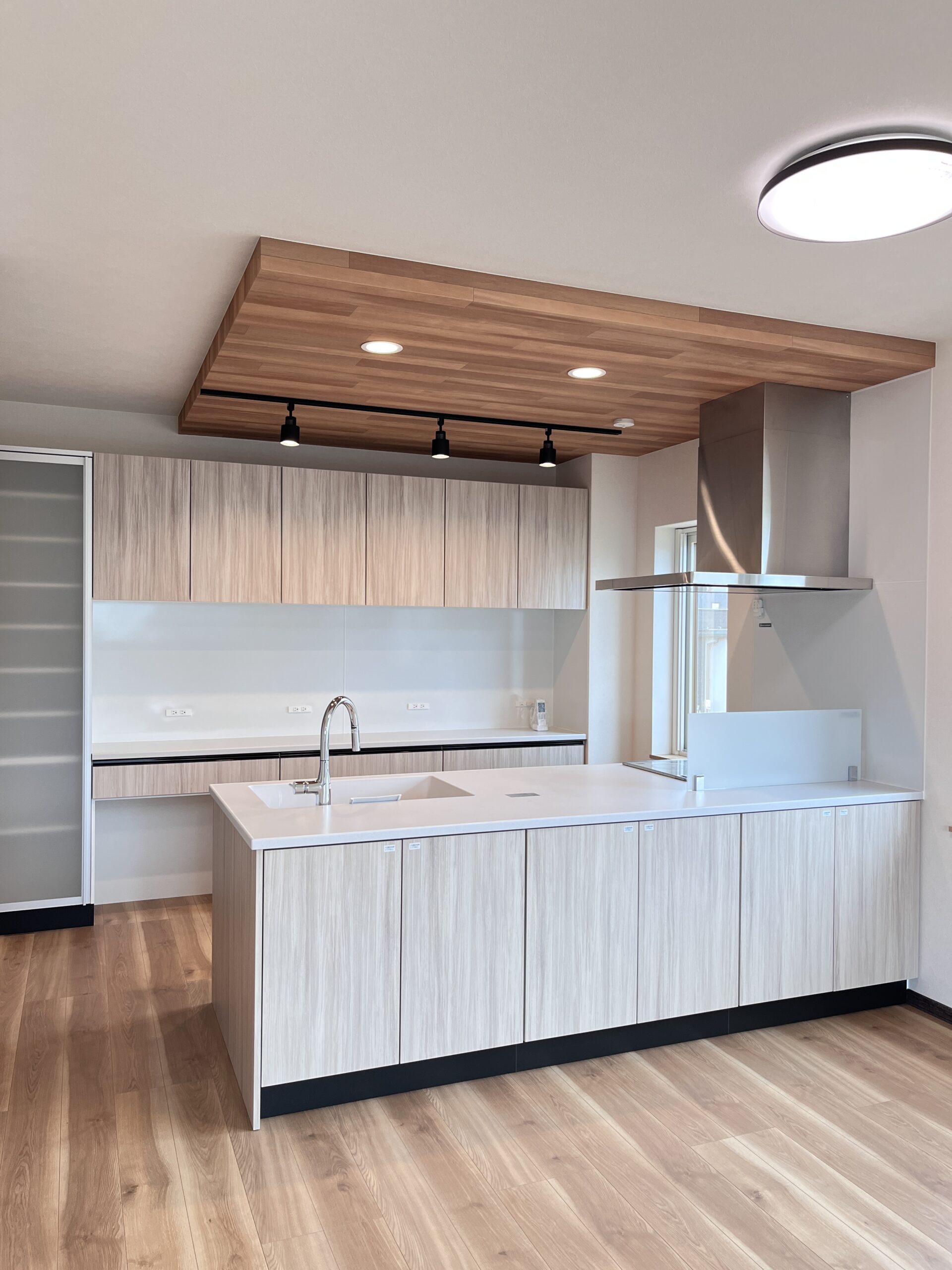 プッシュラッチの全面収納、コの字型のカップボード、さらにキッチン横のパントリーで、圧倒的な収納力を実現しています。