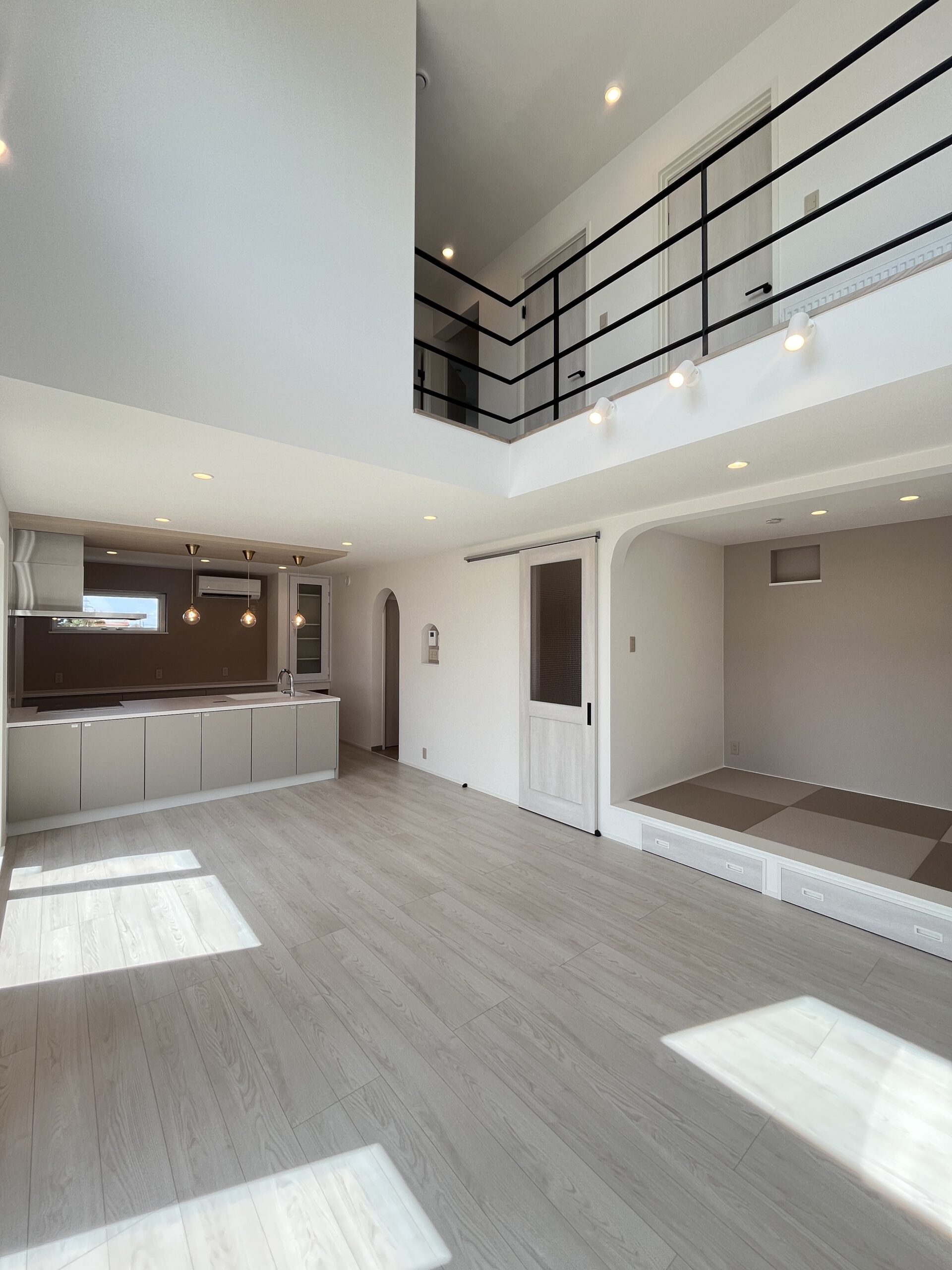 18帖のLDKに約6帖相当の吹き抜けを組み合わせ、数字以上の開放感を実現しました。