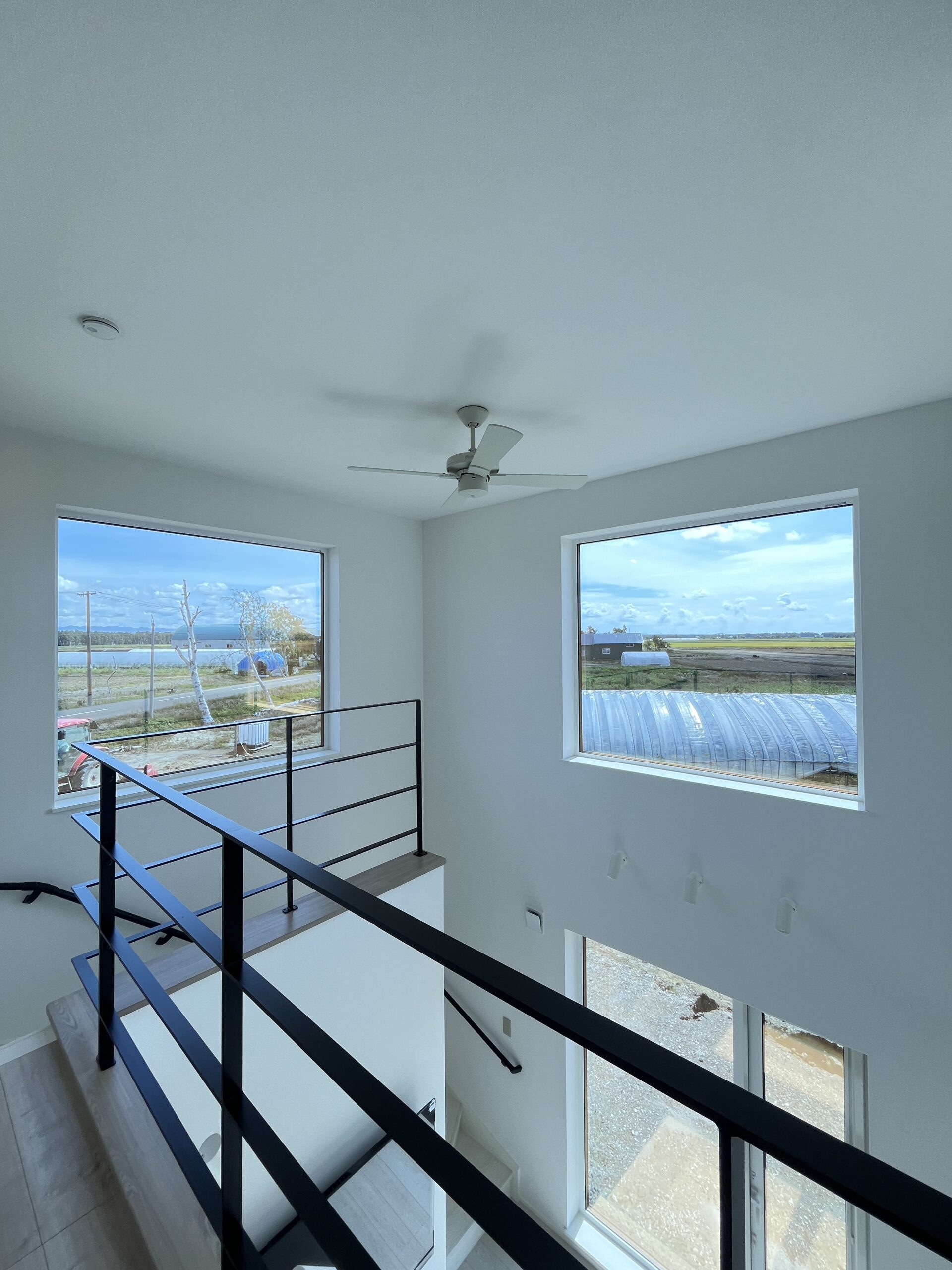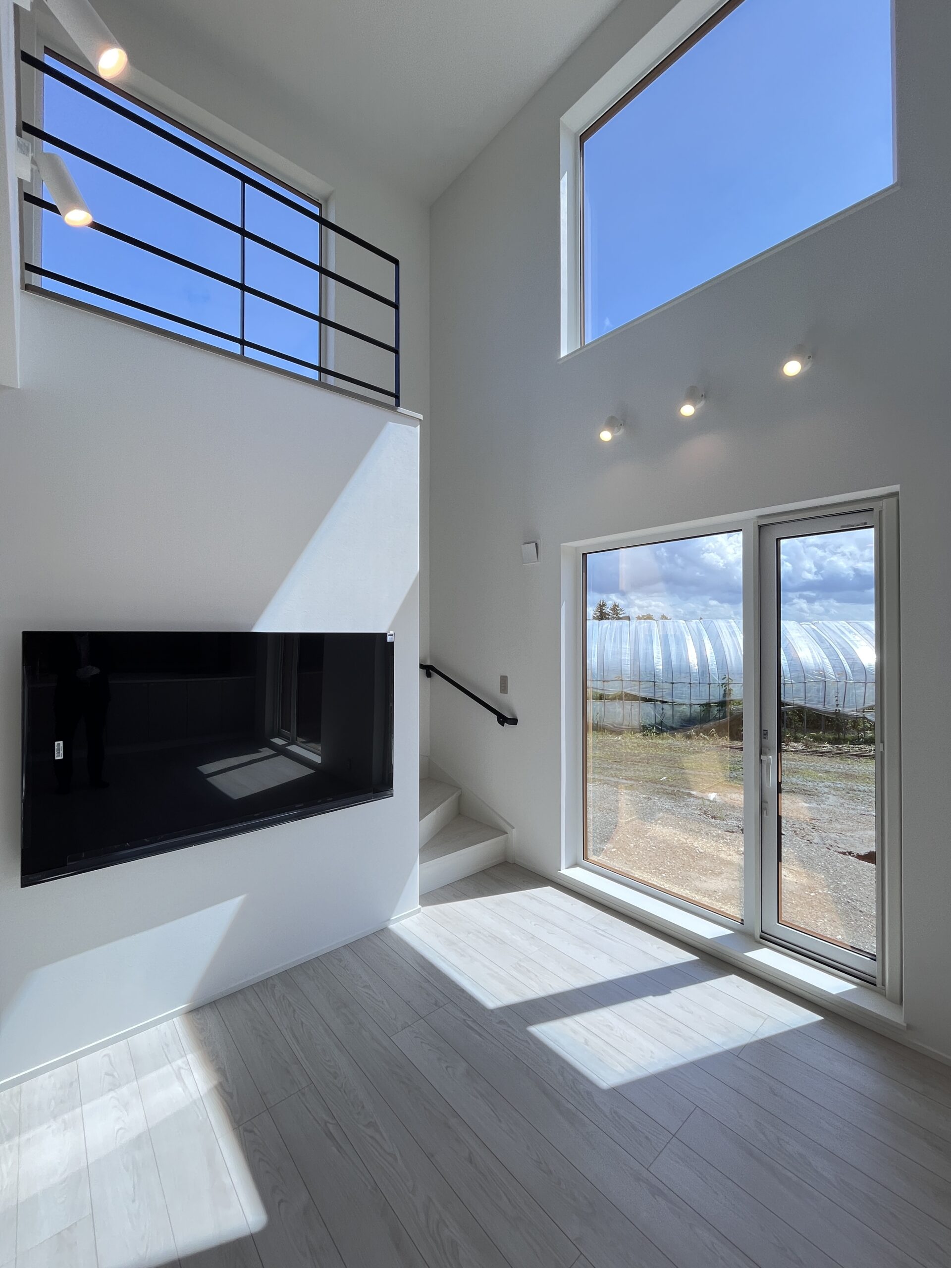 大開口から光をたっぷり取り込み、階段のアイアン手すりがやわらかな空間にアクセントを加えます。