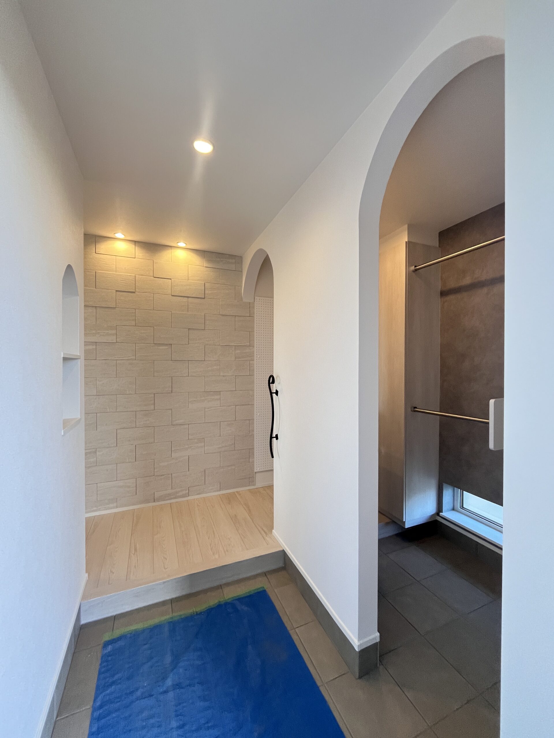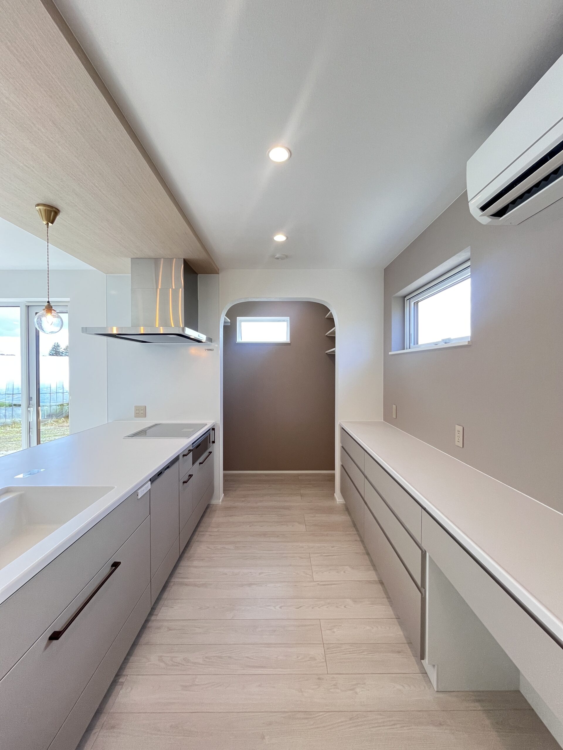 アールの下がり壁の奥には可動棚付きのパントリーを配置し、食品や日用品をまとめて収納できます。