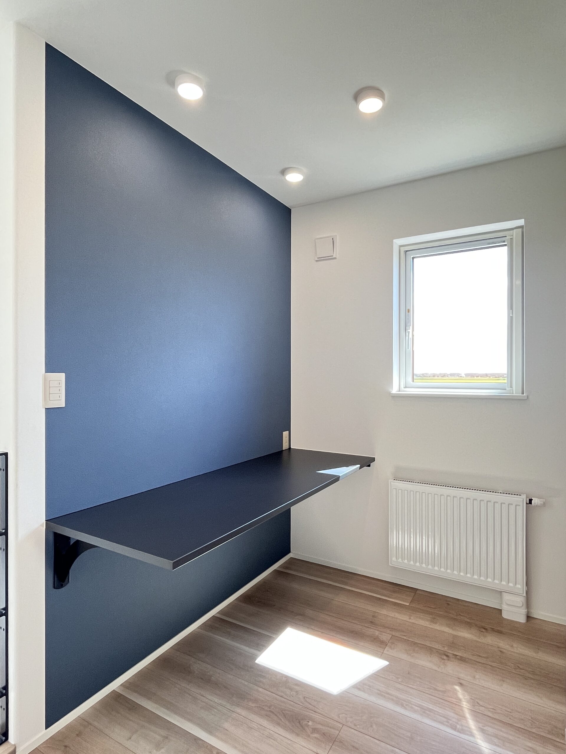 ホールには書斎スペースを設け、業務上の書類や本が多いご要望に合わせて、大容量の収納棚と広めのカウンターを計画しました。