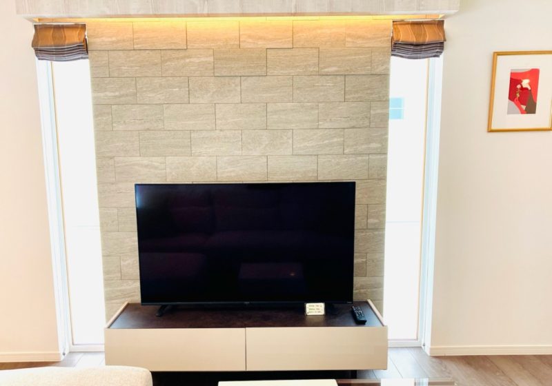 元江別展示場では1階リビングのTVコーナーにエコカラットの壁を張っております。