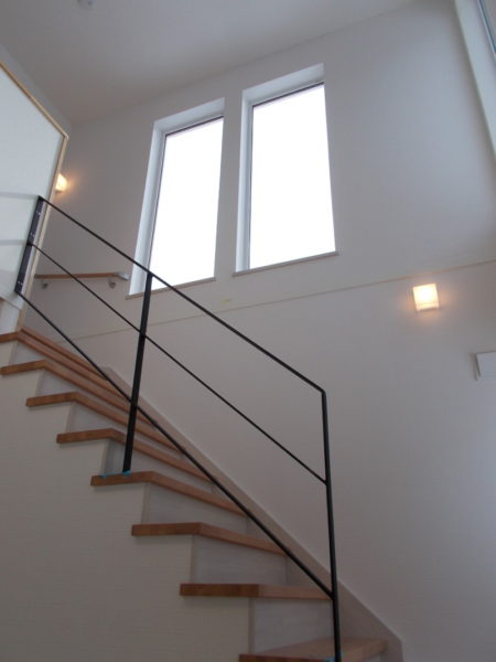 階段手摺りをブラックのスチール製にした上に吹抜けを大きめに作り、解放感と高級感を演出しています。