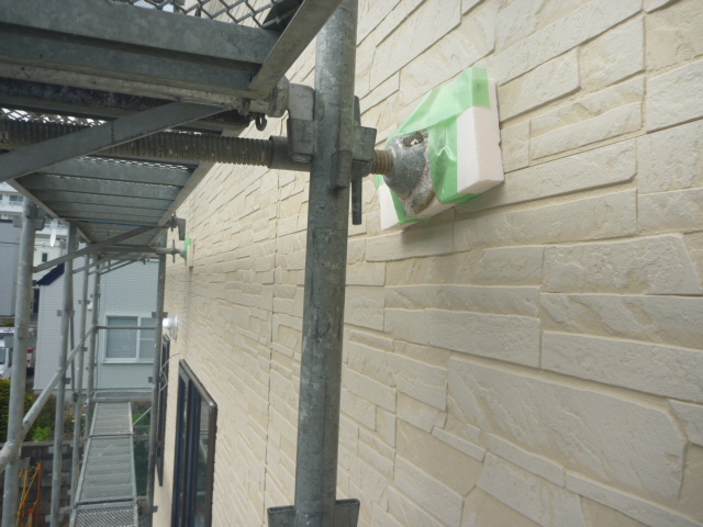 足場が強風などで倒れないように壁つなぎ材を使用してます。また、足場のゆれを防止して、作業しやすくしています。