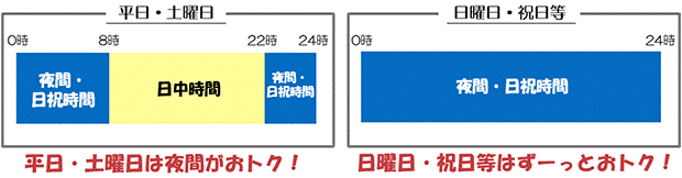 ・電力量料金を「日中時間」と「夜間・日祝時間」の2時間帯別に設定し、日曜日、祝日は1日中お得にご利用可能です。