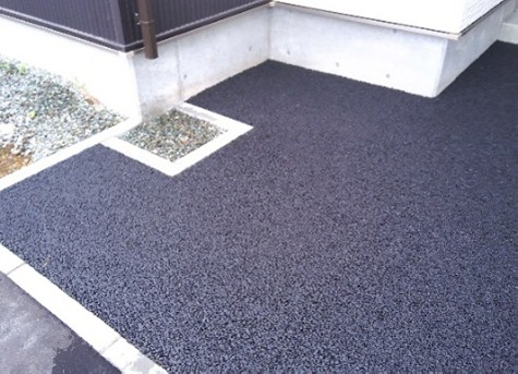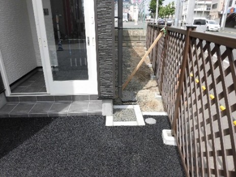 ただし注意点として、雨どいの下など雨水が集中する場所では、写真のように民地石で囲い、化粧砂利を多めに敷くなどの工夫が必要です。