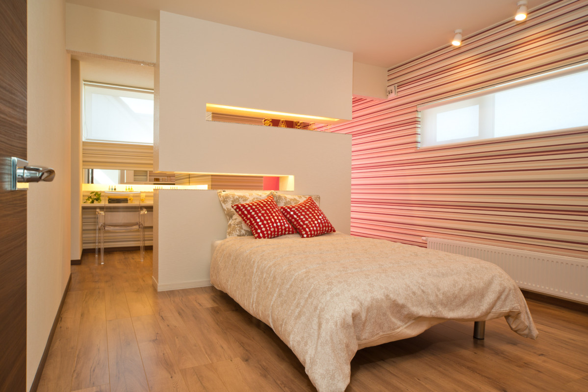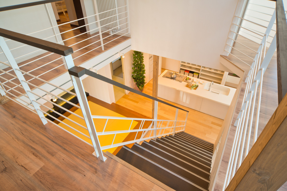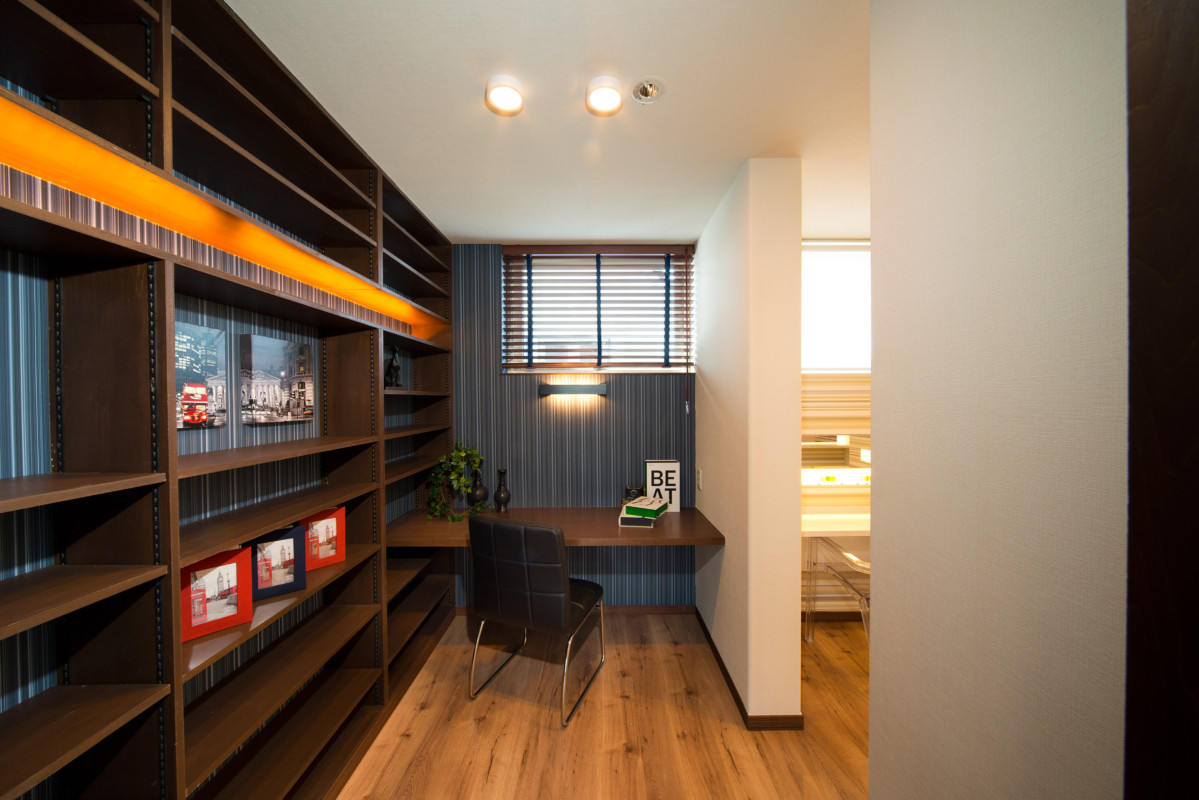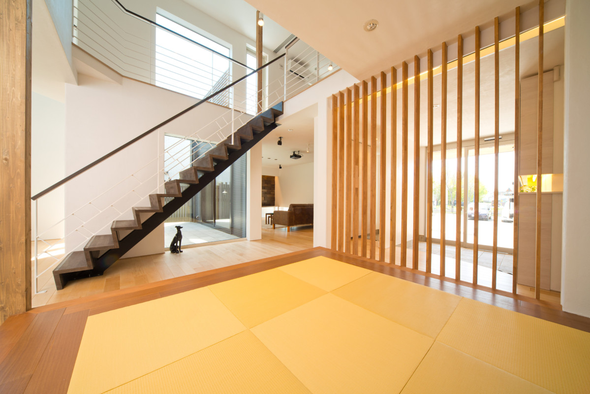 どこにいても家族の気配を感じ取れたり、自然に顔をあわせる機会を生み出す提案がいっぱいのモデルハウス。住まいの中心にオープン階段と中庭を配しました。またリビングには上下階を結ぶ吹抜けを採用。開放感あふれる空間構成が家族のふれあいを育む住まいです。